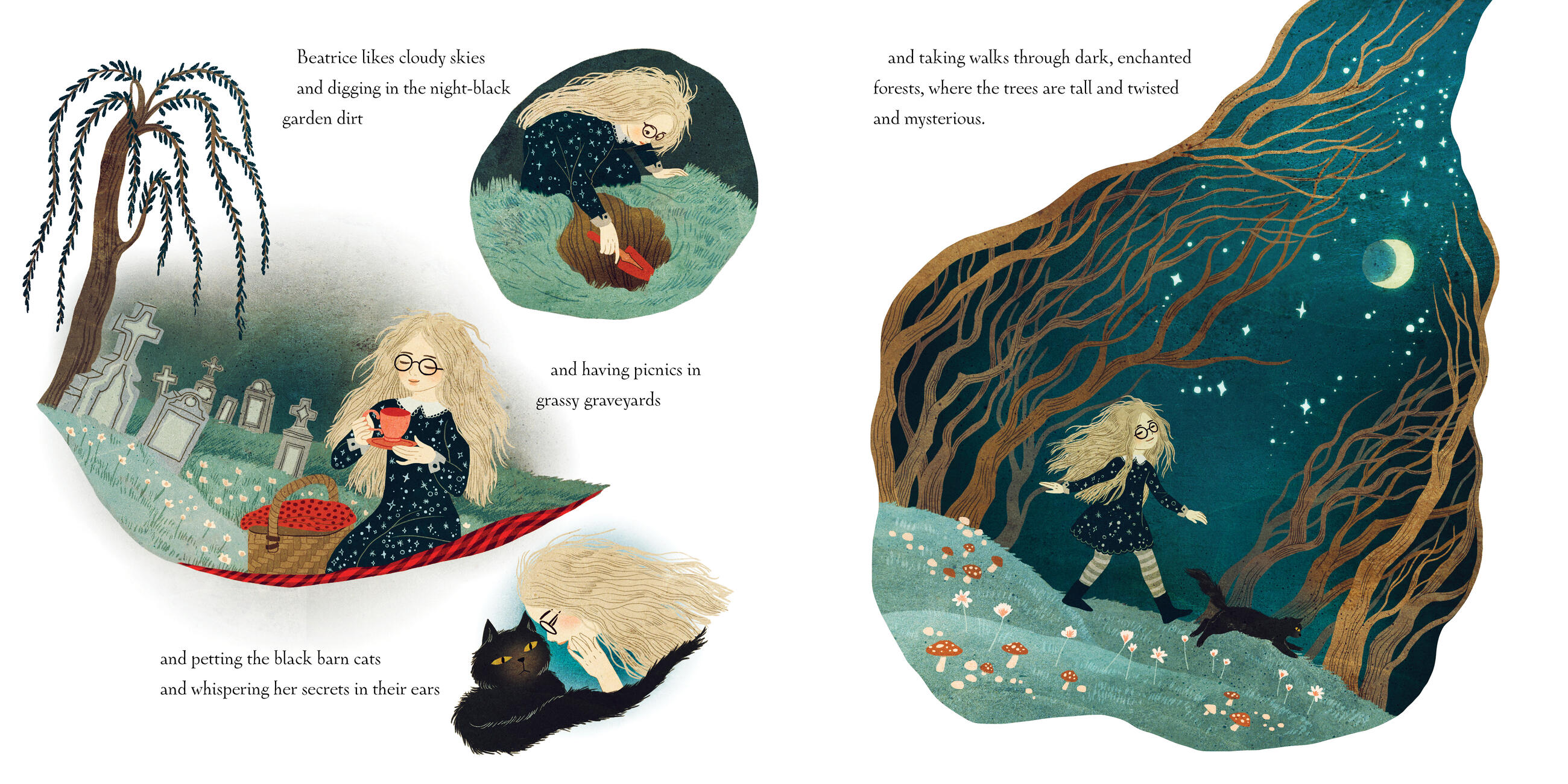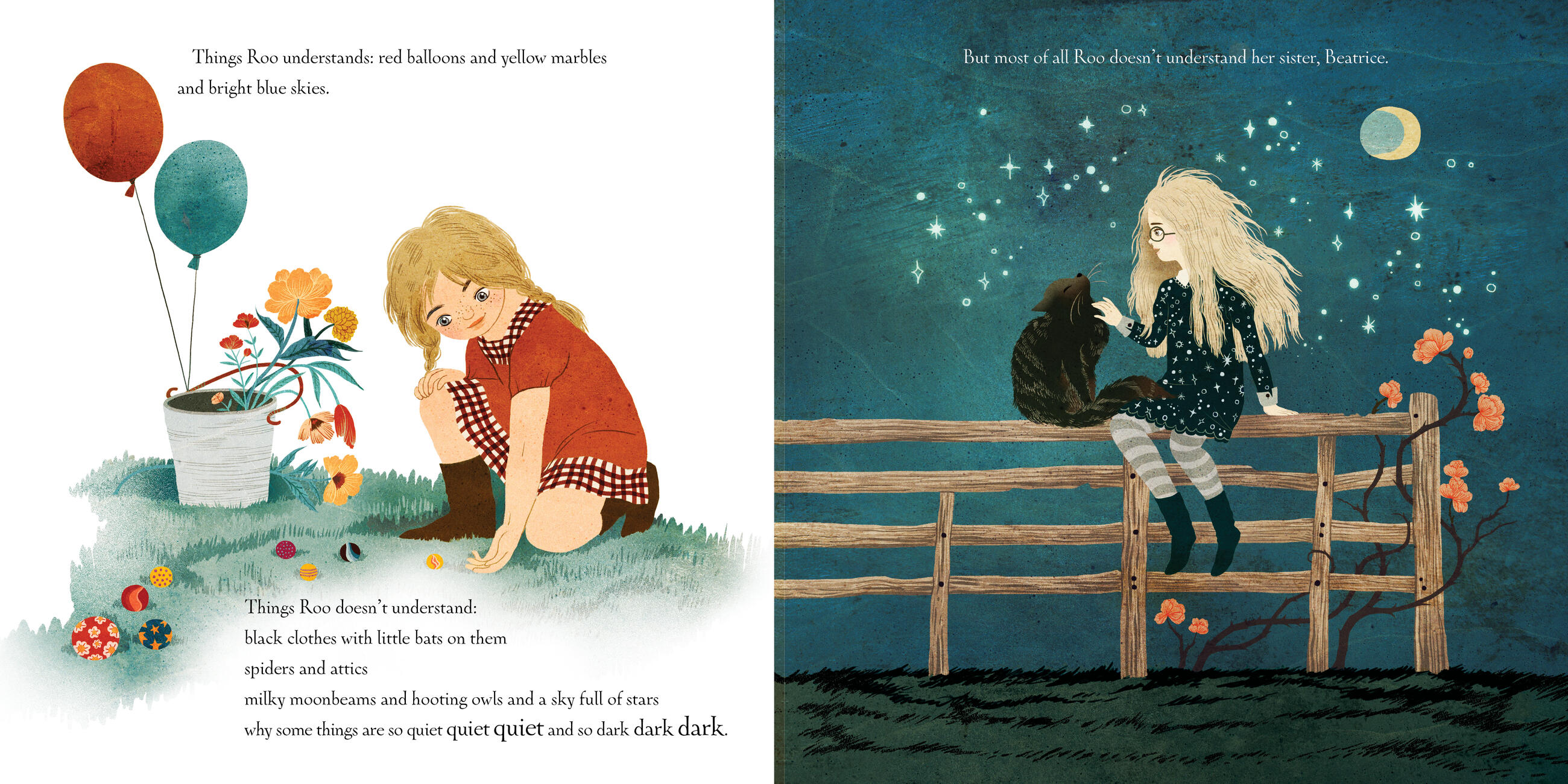 Beatrice likes the dark. She likes black clothes, graveyard picnics, and a sky full of stars. Her sister, Roo, likes the light. She likes bright clothes, picking strawberries, and hot, sunny days. Can Beatrice help Roo love the dark as she does? Can Roo help Beatrice love the light? Or are they simply too different to get along?
