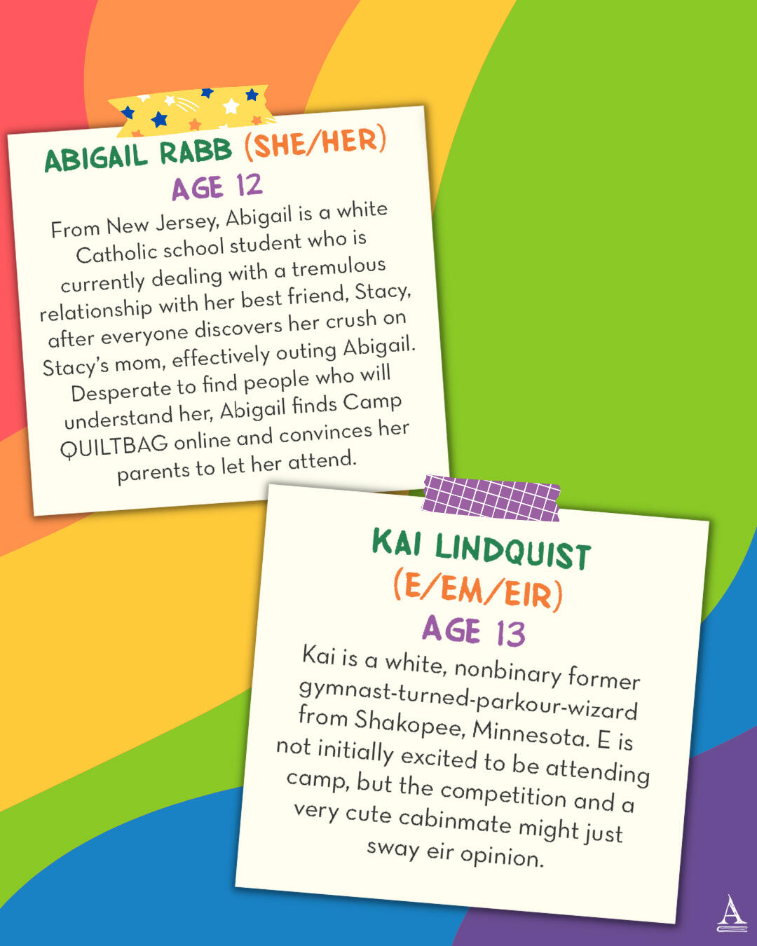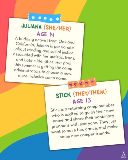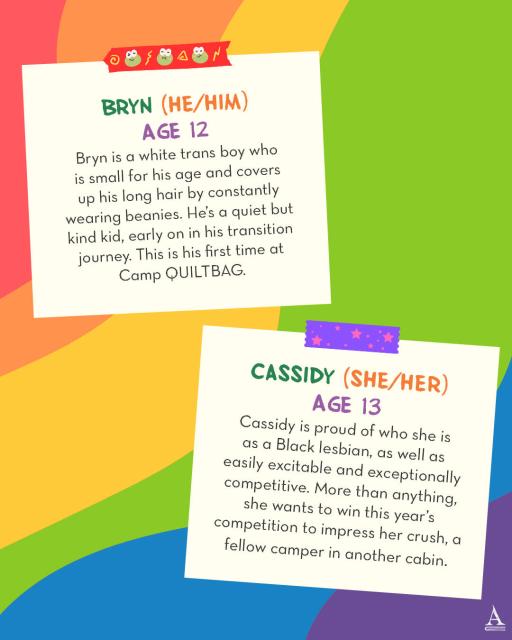 Twelve-year-old Abigail (she/her/hers) is so excited to spend her summer at Camp QUILTBAG, an inclusive retreat for queer and trans kids. She can’t wait to find a community where she can be herself—and, she hopes, admit her crush on that one hot older actress to kids who will understand.
